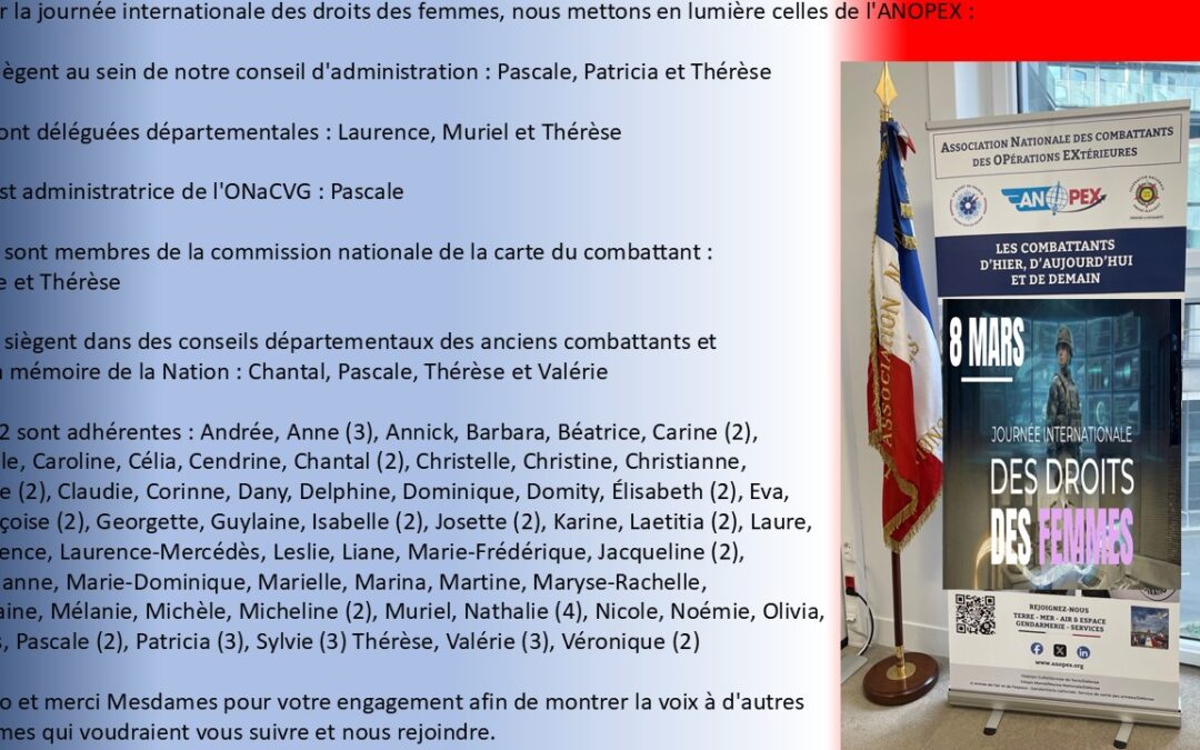 Assises du monde combattant Le 13 avril le président de l’ANOPEX a assisté au discours de lancement des assises du monde combattant à Balard par Mme Alice Rufo, ministre déléguée auprès de la ministre des armées et des anciens combattants A retrouver en vidéo,...
