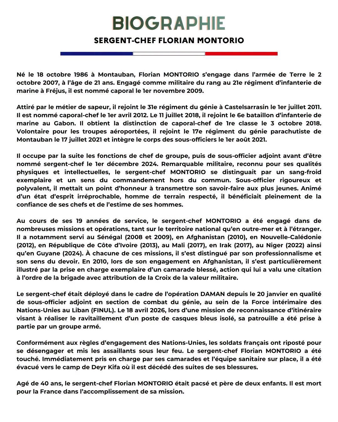 Le sergent-chef Florian Montorio du 17ème RGP est mort pour la France au Liban le 18 avril 2026 à l’âge de 40 ans.